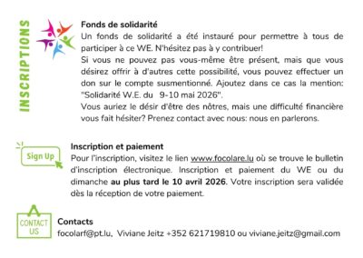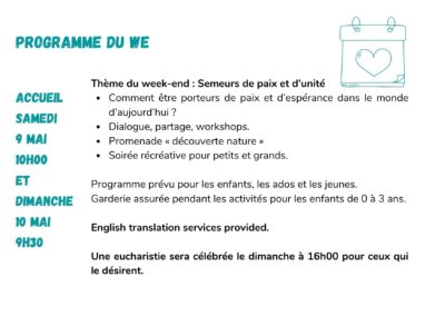 Quatre jours en crescendo, une météo de rêve, une atmosphère de famille et de simplicité joyeuse, environ 300 participants de tous les âges (beaucoup de jeunes familles avec enfants et de nombreux ados), des portes qui se sont ouvertes vers nous-mêmes, vers l’autre, vers Dieu, pour être artisans de paix là où nous vivons, être […]