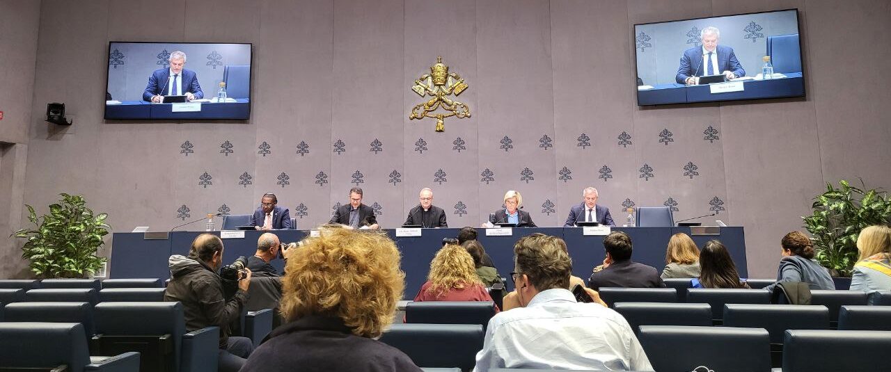 Conférence de presse de présentation du deuxième rapport annuel de la Commission pontificale pour la protection des mineurs. De gauche à droite : Prof. Benyam Dawit Mezmur, juriste, membre de la Commission pontificale ; S.E. Mgr Luis Manuel Alí Herrera, évêque titulaire de Giubalziana ; secrétaire de la Commission pontificale ; S.E. Mgr Thibault Verny, archevêque de Chambéry, évêque de Saint-Jean-de-Maurienne et Tarentaise ; président, Mme Maud de Boer-Buquicchio, juriste, chargée du rapport annuel ; Matteo Bruni, directeur de la Salle de presse du Saint-Siège.