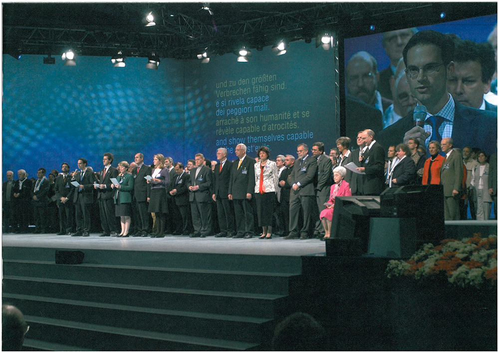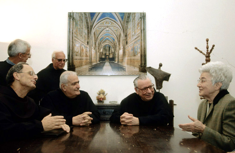 Chiara Lubich con una comunità dei francescani. Sotto: “Insieme per l’Europa”, 8 maggio 2004