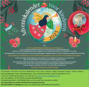 Ook dit jaar wordt de adventskalender van Nieuwe Families verspreid, om samen op weg te gaan naar een vredevol Kerstmis, waaraan we thuis, in de buurt, op school ons steentje willen bijdragen.