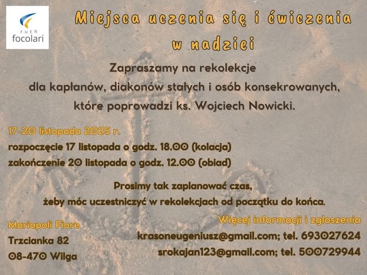 Miejsca uczenia się i ćwiczenia w nadziei 09/11/202517/11/2025 - 20/11/2025 Zapraszamy na rekolekcje dla kapłanów, diakonów stałych i osób konsekrowanych. Share this on WhatsApp17/11/2025to20/11/2025 Recommend on FacebookShare on LinkedinTweet about itTell a friendShare this on WhatsApp Kliknij tutaj, aby anulować odpowiadanie. Imię* Email* Twój komentarz Regulamin(500) Wyślij