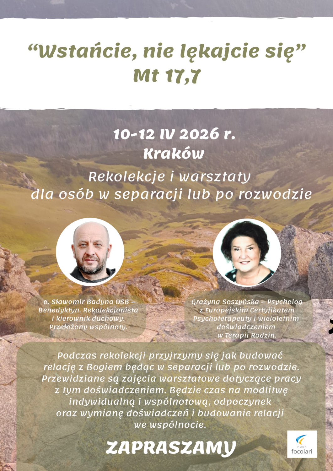 Podczas rekolekcji przyjrzymy się jak budować relację z Bogiem będąc w separacji lub po rozwodzie. Przewidziane są zajęcia warsztatowe dotyczące pracy z tym doświadczeniem. Będzie czas na modlitwę indywidualną i wspólnotową, odpoczynek oraz wymianę doświadczeń i budowanie relacji we wspólnocie.