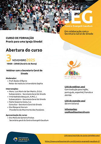 O curso começará no dia 03 de novembro com uma aula especial confiada à Secretaria geral do Sínodo e com a participação de Margaret Karram, presidente do Movimento dos Focolares, que esteve presente nas duas Assembleias sinodais. Esse momento é aberto a todos.